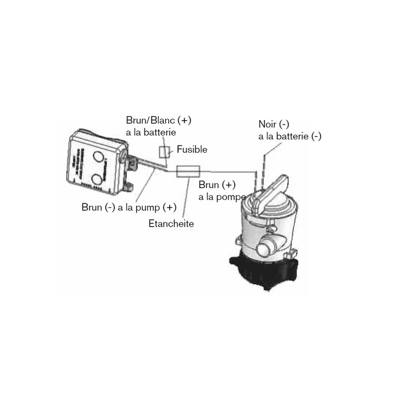 le conducteur Brun avec le Marquage Blanc à la borne positive (+ position Auto) du tableau de commande (fusible en ligne nécessaire). Le conducteur négatif Noir (-) de la pompe est toujours mis à la terre.