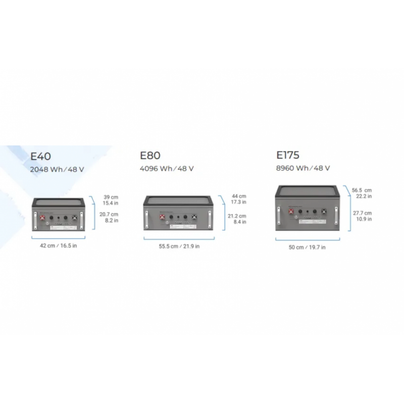 | Capacité | 2048 Wh / 40 Ah | 4096 Wh / 80 Ah | 8960 Wh / 175 Ah |