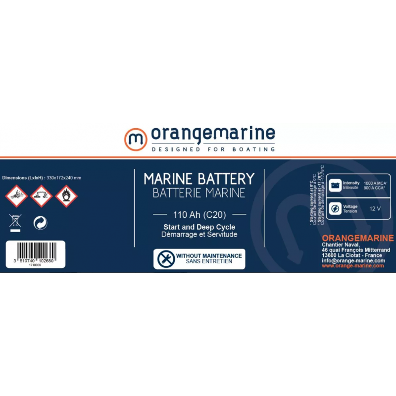 Batterie marine 12V à décharge lente DUAL - ORANGEMARINE 110 Ah
