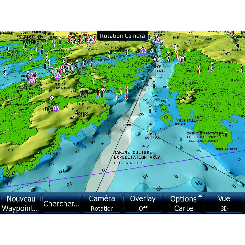Vues 3D plus réalistes des fonds sous-marin et du relief terrestre côtier avec report de la position du bateau.