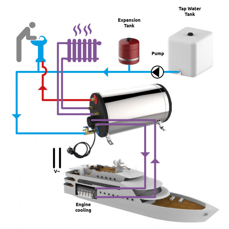 Cette technologie permet de chauffer l'eau à partir du moteur (mais aussi grâce au 220V au quai ou en mer sur convertisseur).