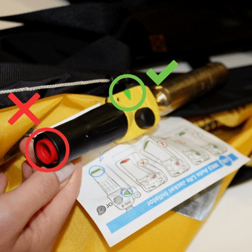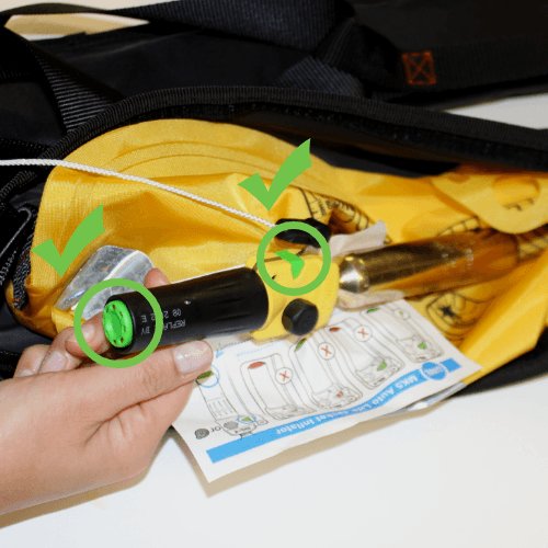 Nous vous recommandons de vérifier le percuteur (Kit d'armement) avant de mettre le gilet de sauvetage en veillant à ce que la bouteille de CO2 ne soit pas percée. La cartouche contenant la pastille de cellulose ne doit pas être périmée et doit être complètement vissée à la main. Assurez-vous également que le gonfleur est en bon état, qu’il ne soit pas endommagé et vérifiez que tous les indicateurs soient corrects.