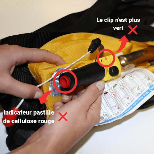 Ici le clip vert n'est plus présent, il faut alors réarmer votre gilet. |