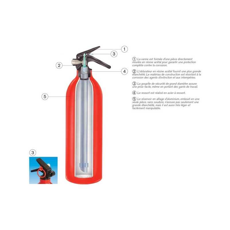 Le corps de vanne de cet extincteur à poudre est en résine acétal équipé d’un filtre de protection pour éléments sensibles garantissant une protection complète contre la corrosion.