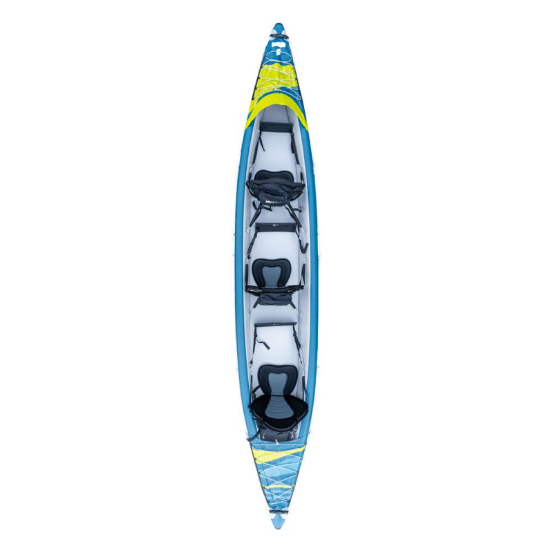 Le kayak Air Breeze Full HP 3 peut être utilisé par trois personnes. Avec ses dimensions généreuses, vous pouvez aussi emporter du matériel avec vous. Gonflé à haute pression, ce kayak devient très rigide et offre les mêmes performances qu'un kayak rigide.