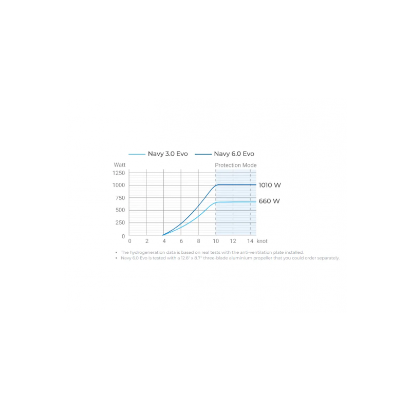 Les moteurs Navy Evo sont dotés d’une fonction de production hydroélectrique lorsque l’hélice tourne entre 4 et 10 nœuds (moteur hors tension et avec batterie(s) Epropulsion E-Series), fonction qui permet de recharger la batterie lorsque vous naviguez à la voile, ce qui leur confère une plus grande autonomie pour une navigation plus longue et encore plus économique et écologique !