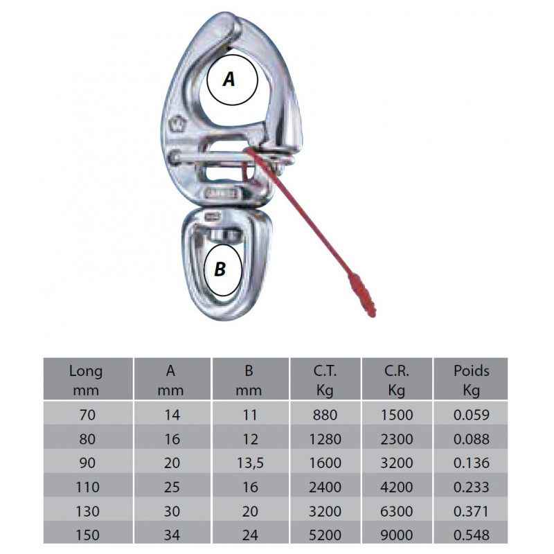 Caractéristiques du Mousqueton inox HR œil émerillon à ouverture sous charge WICHARD :