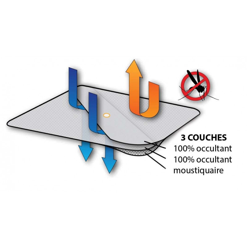 Les rideaux occultants sont constutiés de 3 couches de matières différentes qui permettent dans l’ordre de réfléchir la lumière vers l’extérieur (couleur argent), laisser passer l’air et enfin faire barrage aux moustiques (couleur blanche pour se fondre avec le vaigrage).