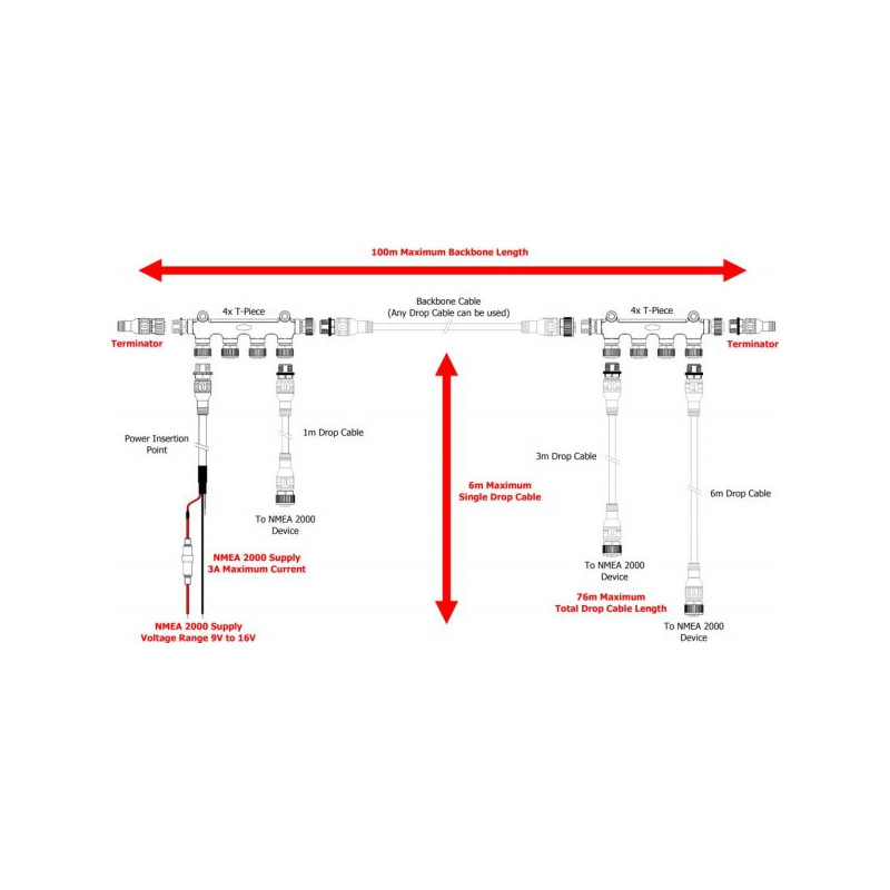 La longueur maximale d’un seul câble est de 6 m et la longueur totale de tous les câbles doit être inférieure à 76 m. Veuillez noter que tous les câbles de dorsale NMEA 2000 de Digital Yacht peuvent également être utilisés en tant que câbles pour étendre un réseau NMEA 2000. Un câble de dorsale peut se connecter à la place des terminateurs de deux colonnes d’un réseau NMEA 2000 afin d’avoir un réseau NMEA 2000 d’une plus grande longueur comme expliqué sur le schéma ci-dessous.