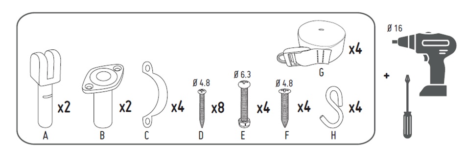 Le bimini est livré avec un ensemble d’accessoires permettant de fixer, maintenir et replier votre bimini. La notice de montage est incluse et téléchargeable également sur cette page.