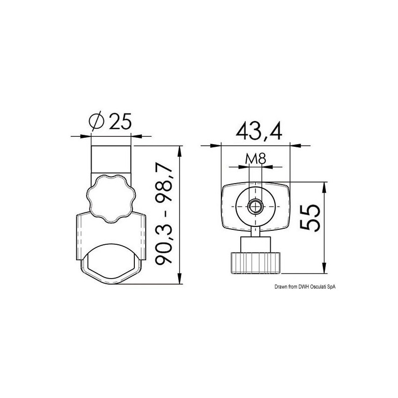 Base de fixation en inox et en aluminium. Projecteur amovible grâce au système de fixation avec pommeau en plastique.