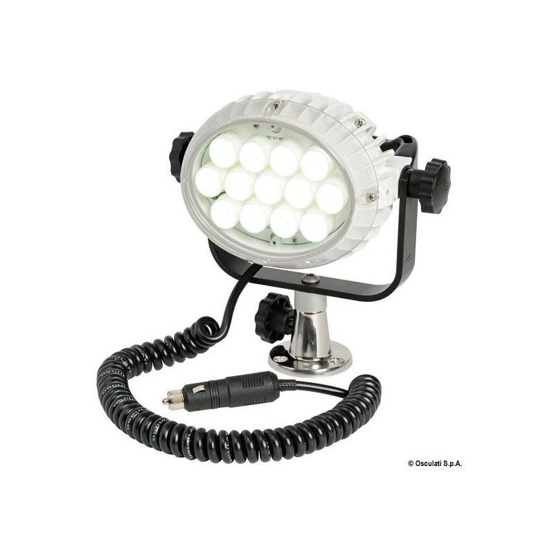 Ce projecteur LED en aluminium vernis blanc, ABS et socle en inox est fait pour se fixer sur plan, avec sa base de fixation fournie. Equipé de 13 ampoules LED blanches d'une durée de vie de 50 000 heures, ce projecteur vous offre une grande puissance tout en consommant peu. Le bloc est amovible et le câble est extensible jusqu'à 2m. Vous trouverez sur ce projecteur un interrupteur étanche On/Off et un bloc de prise étanche encastrable à installer à l'intérieur ou à l'extérieur.