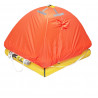 - Le radeau a été conçu pour des situations de navigation modérées: gonflement à 0°C, simple fond, toile de tente orange fluo avec arceau en fibre de verre à déployer manuellement, lampe extérieure 0,75 cd, bandes rétro-réfléchissantes.