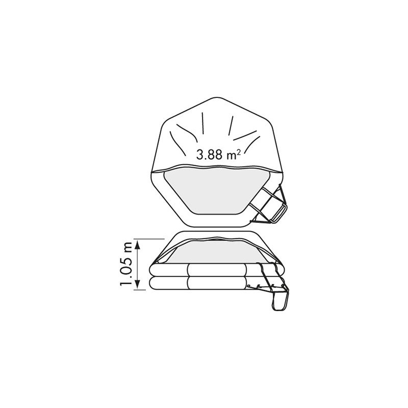 - Conçu pour des conditions extrêmes d'utilisation : nombre et volume important des poches à eau, ancre flottante de grande surface, gonflement à -15°C, double fond isolant, tente orange fluo avec arceau gonflable automatique, lampe extérieure 4,3 cd, 1500 cm2 de bandes radarisables et rétro-réfléchissantes.