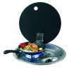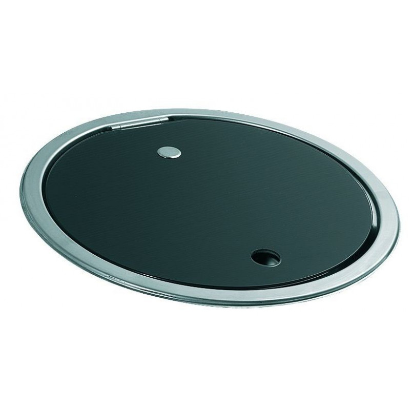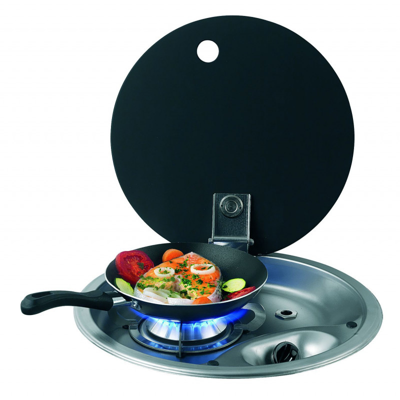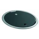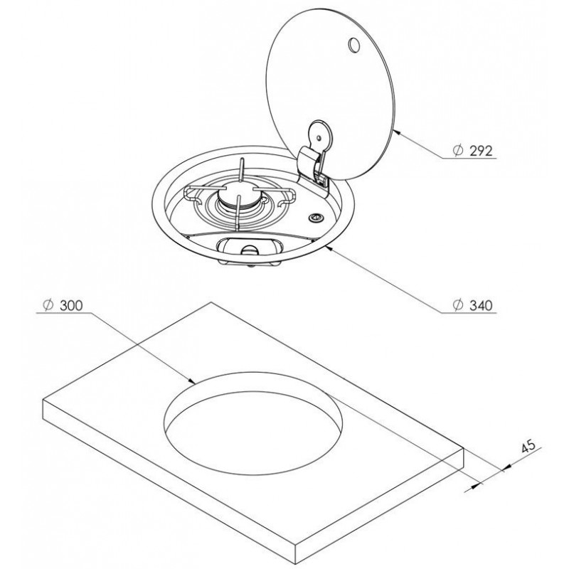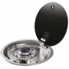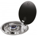 Table de cuisson en acier inox rond encastrable à gaz 1 feu avec brûleur muni d'un petit couvercle autobloquant, grille en inox de soutien fixée par des patins anti-vibration. Couvercle en verre noir trempé avec charnières rétractables .
