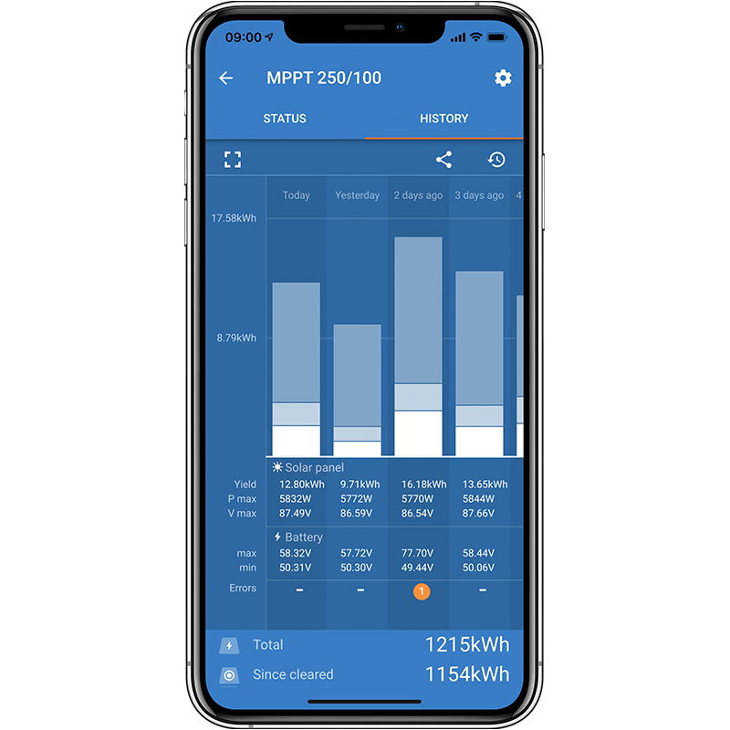 Le SmartSolar est équipé de la fonction sans fil, ce qui lui permet de communiquer ses informations directement au serveur Victron. Vous pouvez ainsi consulter les données relatives à vos panneaux en temps réel sur l'application ou sur le portail internet Victron, que vous soyez sur votre bateau ou à des centaines de kilomètre. Vous avez également la possibilité de le connecter avec des câbles VE.Direct à tous les appareils de monitoring de la gamme GX, ou à votre PC.
