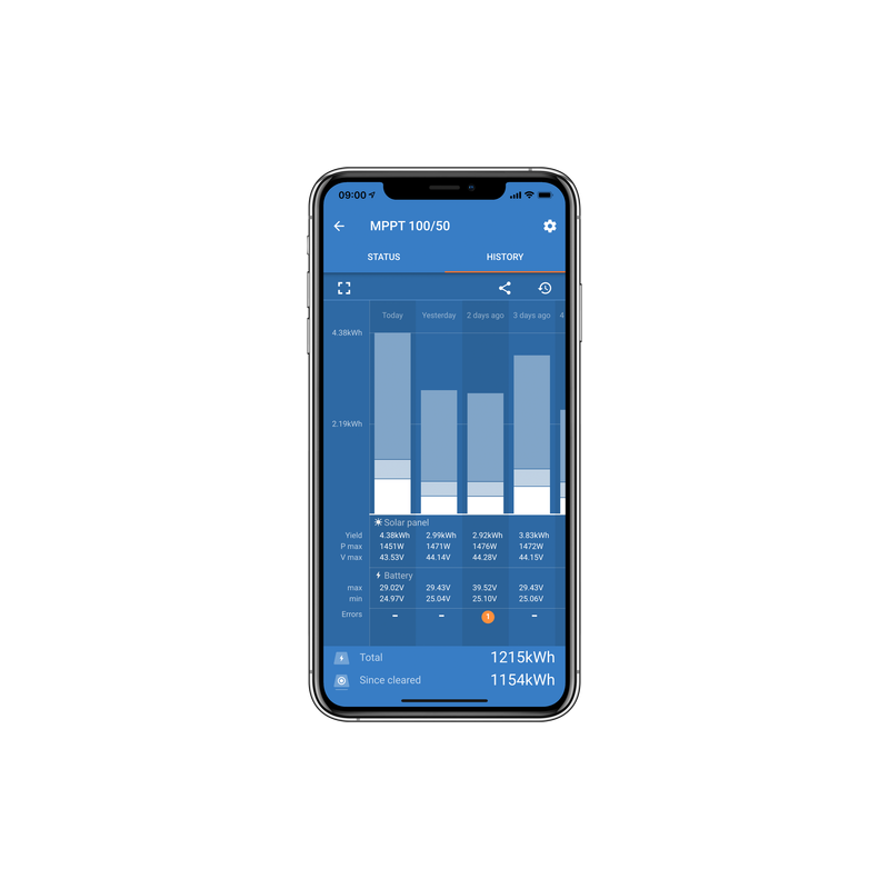 Le SmartSolar est équipé de la fonction sans fil, ce qui lui permet de communiquer ses informations directement au serveur Victron. Vous pouvez ainsi consulter les données relatives à vos panneaux en temps réel sur l'application ou sur le portail internet Victron, que vous soyez sur votre bateau ou à des centaines de kilomètre. Vous avez également la possibilité de le connecter avec des câbles VE.Direct à tous les appareils de monitoring de la gamme GX, ou à votre PC.