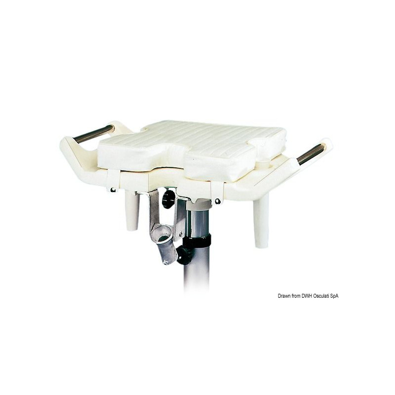 Siège de combat spécial pêche en polyéthylène blanc, équipé de poignées de prise latérales en inox, deux porte-cannes à pêche latérales semi-basculants, un porte-cannes central basculant en aluminium.