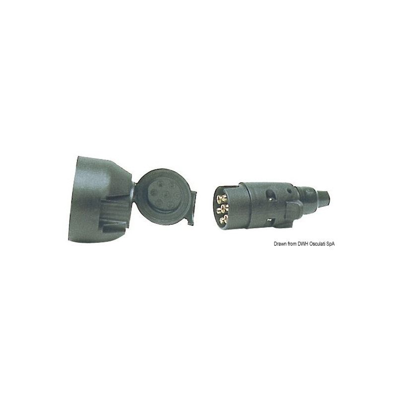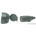 Prise + fiche 7 pôles réglementaires pour remorque. Conçues en ABS noir et laiton. Modèle résistant au temps, totalement inoxydable, voltage 12 V.