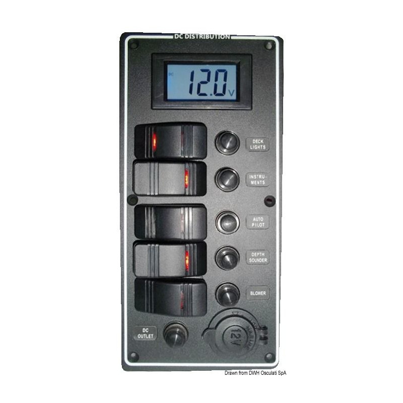 TABLEAU ÉLECTRIQUE 5 INTERRUPTEURS AVEC PRISE ALLUME-CIGARE ET VOLTMÈTRE DIGITAL 12/24 V