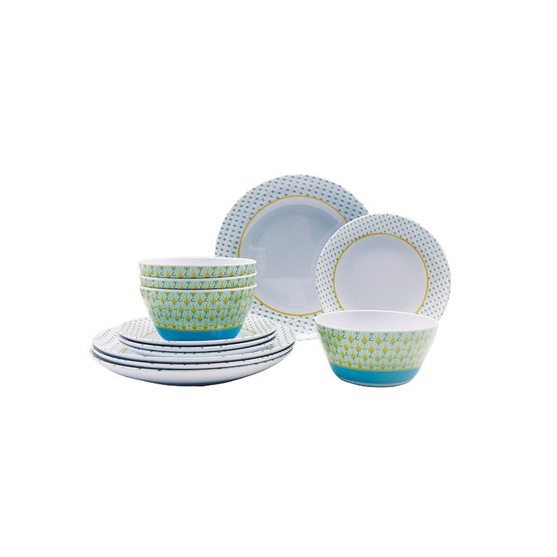 Le pack vaisselle paon de chez INCASA est entièrement composé de mélamine. Tous les élements sont dotés d'un socle antidérapant afin de s'adapter au mieux à une utilisation en transport (camping-car, caravane, bateaux,...). Ils sont résistants aux rayures et passent au lave vaisselle.