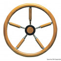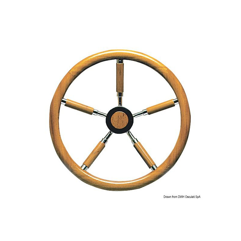 Cette barre à roue est constituée d'un moyeu en inox, de branches en inox et teck, et d'une couronne en teck.