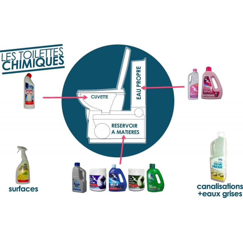 Verser 60 ml de Elsan double rinse (2 litres) dans le réservoir de la chasse d’eau de vos toilettes chimiques, par 10 litres de capacité.